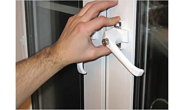 Обычно причиной становится невозможность повернуть ручку в положении, когда окно открыто. В зависимости от марки фурнитуры следует найти торчащую возле ручки металлическую пластину либо металлический язычок, торчащий под углом к раме. В первом случае прижимаем пластину пальцем в сторону уплотнителя и поворачиваем ручку, во втором – надавливаем на язычок, поворачивая его параллельно уплотнительной резинке.