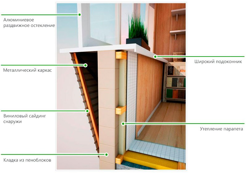 - Для защиты металлических элементов от влаги, балконный парапет снаружи облицовывается виниловым профлистом, который, кроме всего прочего, придает аккуратный вид вашему балкону снаружи. Изнутри же парапет тщательно утепляется и отделывается выбранными вами материалами (деревянная вагонка, пвх, гипсокартон и пр.)