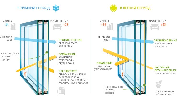 Львиная доля теплопотерь помещения происходит именно через оконные стекла. Это самая холодная поверхность внутри любой комнаты. Чтобы сохранить больше тепла внутри, придумали стеклопакеты из низкоэмиссионного стекла с покрытием оксидами металлов. Такое покрытие отражает тепловые лучи, не позволяя им проникать через барьер. Благодаря этой технологии энергосберегающий стеклопакет зимой сохраняет тепло, а летом – прохладу.