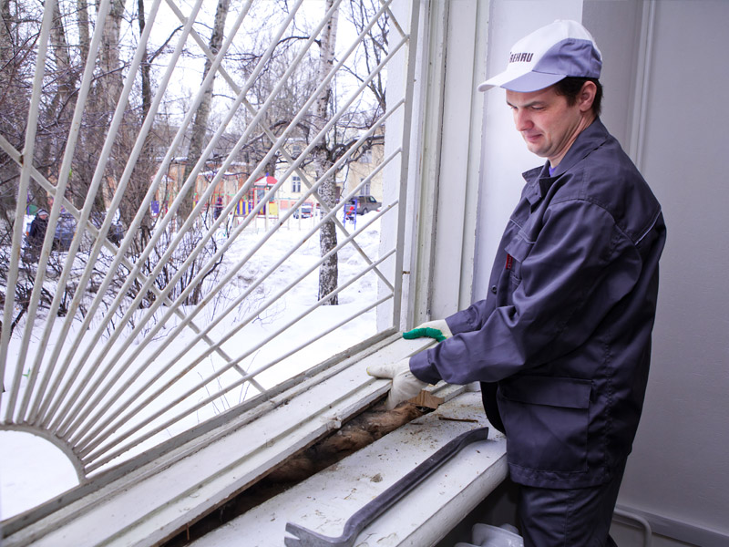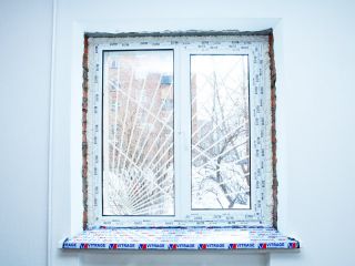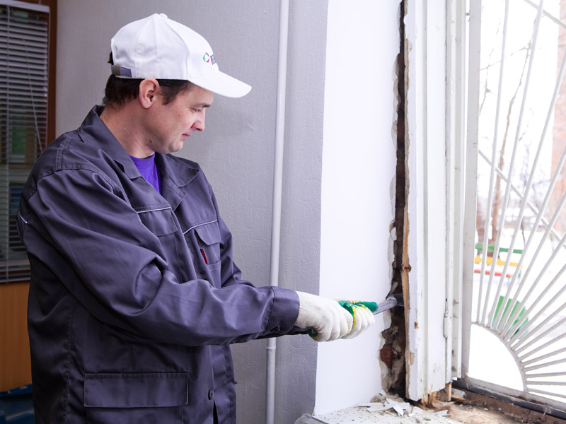 убираются старые подоконники и отливы. После демонтажа оконный проем