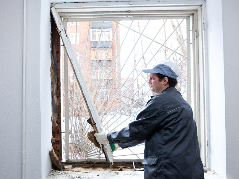 окна. Вначале снимаются старые створки, затем распиливается и вынимается рама, в самом конце