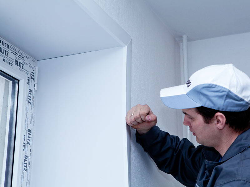 Край верхнего откоса устанавливается строго по горизонтали, а края боковых – по вертикали. Затем зазоры между стеной и откосами запениваются (или утепляются минеральной ватой, все зависит от типа дома). С установленных откосов снимается защитная пленка, а на торцы откосов крепится наличка, которая маскирует стык между стеной и откосами, придавая аккуратный внешний вид окну.